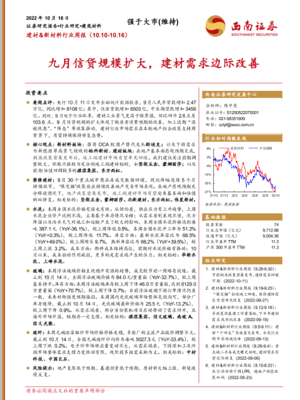 【西南证券】【20221016】建材&新材料行业周报:九月信贷规模扩大,建材需求边际改善-20页 行业研究
