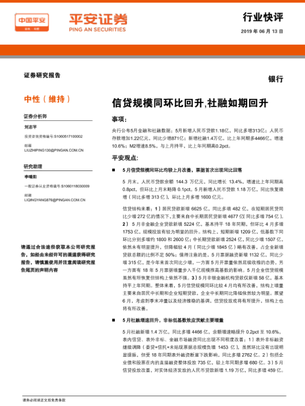 【平安证券】【20190613】银行:信贷规模同环比回升,社融如期回升-4页 行业研究