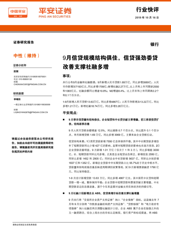 【平安证券】【20191016】9月信贷规模结构俱佳,信贷强劲委贷改善支撑社融多增-5页 行业研究