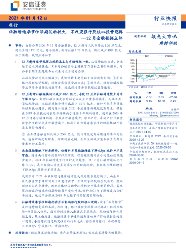 【安信证券】【20210112】12月金融数据点评-社融增速季节性短期波动较大,不改变银行股核心投资逻辑-4页 行业研究
