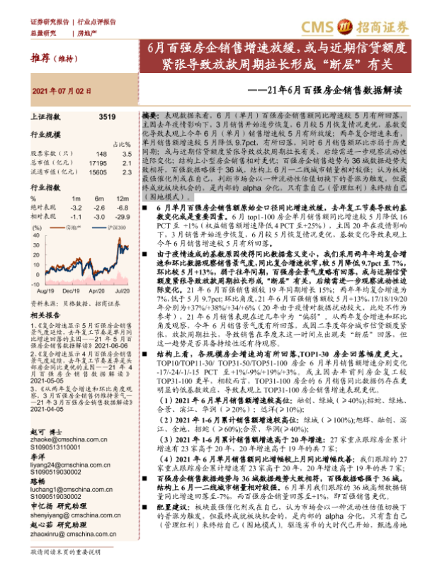 【海通证券】【20210702】6月百强房企销售增速放缓,或与近期信贷额度紧张导致放款周期拉长形成“断层”有关-3页 行业研究