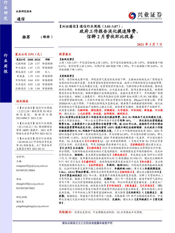 【兴业证券】【20210307】通信行业周报(3.01-3.07):政府工作报告淡化提速降费,信骅2月营收环比改善-11页 行业研究