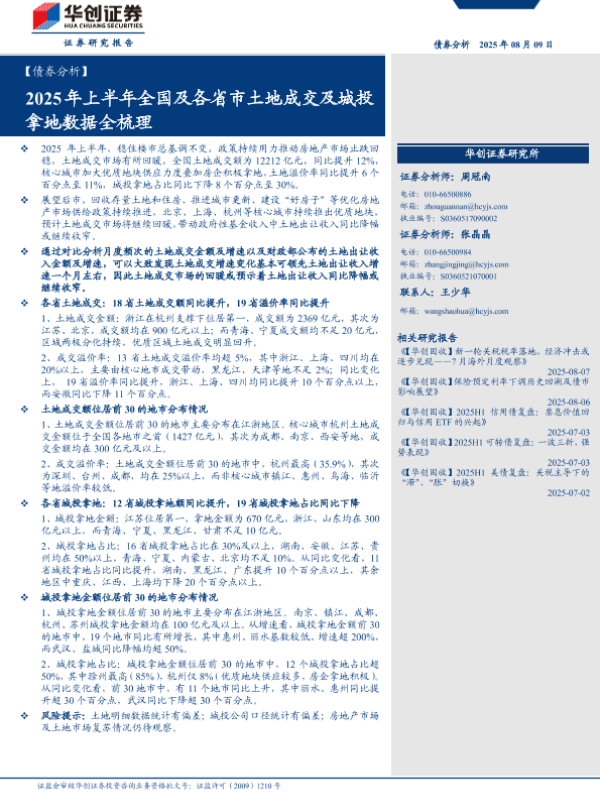 【华创证券】【202508】2025年上半年全国及各省市土地成交及城投拿地数据全梳理-14页 证券期货研究报告