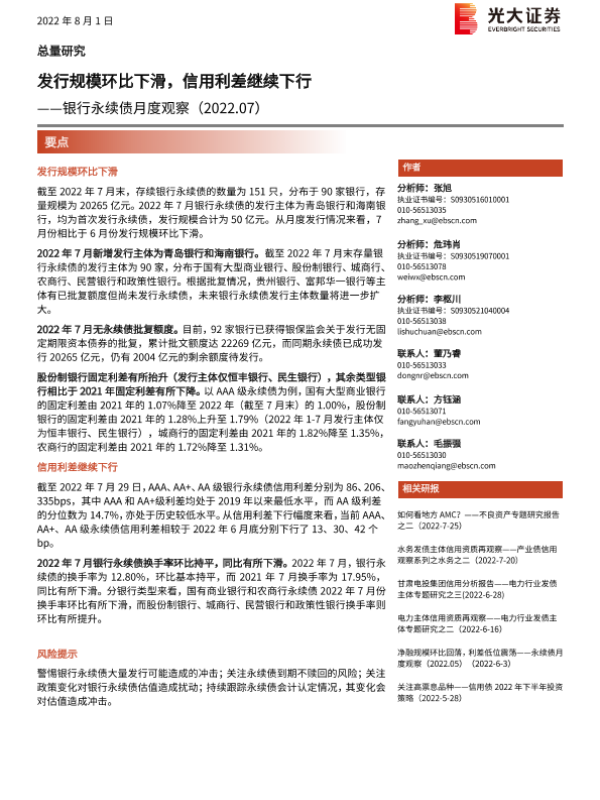 【光大证券】【20220801】银行永续债月度观察:发行规模环比下滑,信用利差继续下行-9页 行业研究