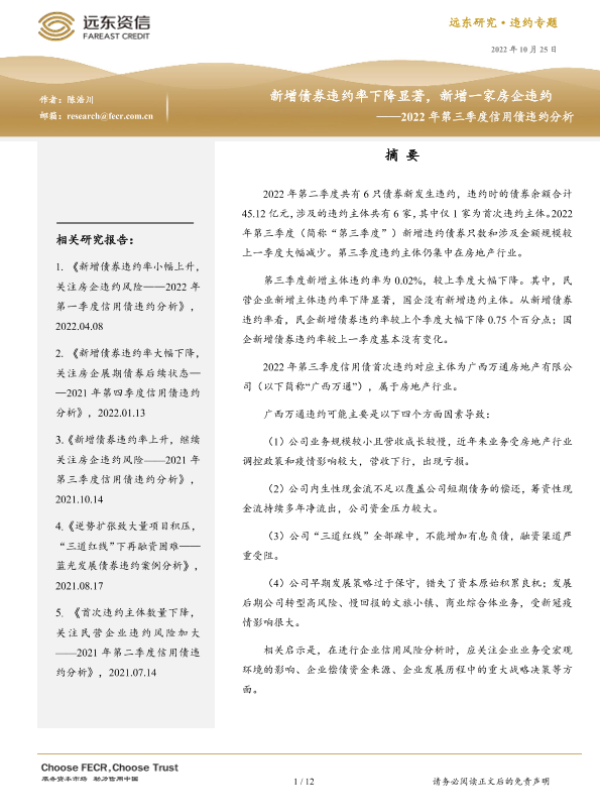 【远东资信】【20221025】新增债券违约率下降显著,新增一家房企违约 ——2022年第三季度信用债违约分析-12页 行业研究