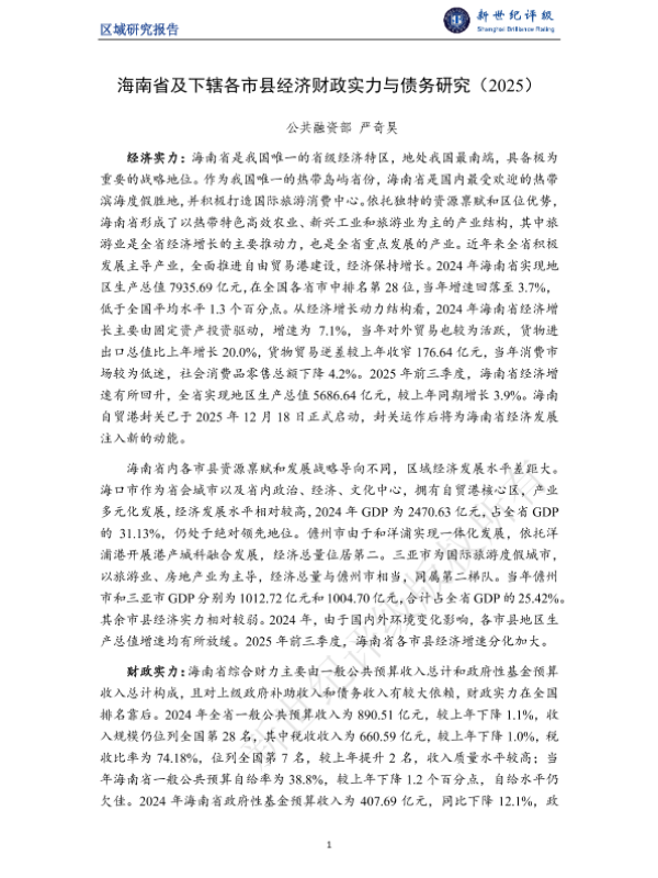 【公共融资部严奇昊】【2025】海南省及下辖各市县经济财政实力与债务研究(2025)-26页 行业研究