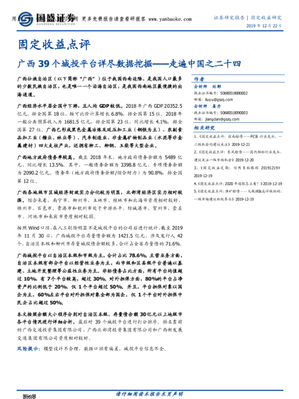 【国盛证券】【20191222】固定收益点评:广西39个城投平台详尽数据挖掘-27页 证券期货研究报告