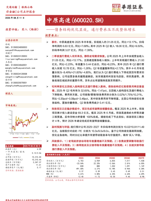 【华源证券】【20250811】中原高速-债务结构优化显效,通行费承压不改整体增长-3页 证券期货研究报告