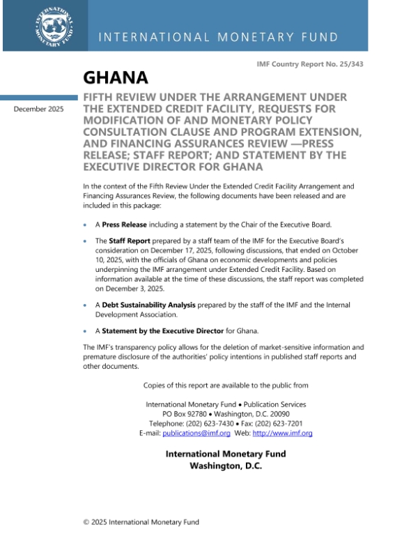 【国际货币基金组织】【202512】FIFTH REVIEW UNDER THE ARRANGEMENT UNDER THE EXTENDED CREDIT FACILITY, REQUESTS FOR MODIFICATION OF THE MONETARY POLICY CONSULTATION CLAUSE AND PROGRAM EXTENSION, AND FINANCING ASSURANCES REVIEW — PRESS RELEASE; STAFF REPORT; AND STATEMENT BY THE EXECUTIVE DIRECTOR FOR GHANA-133页