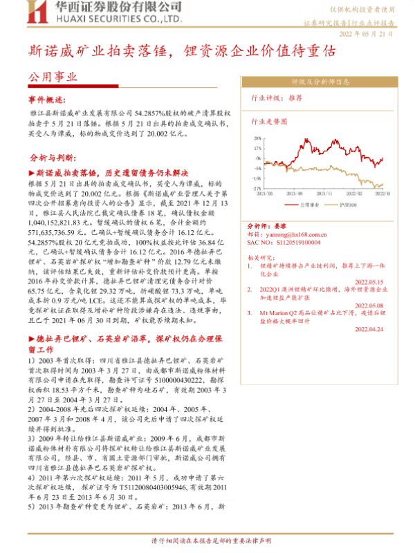 【华西证券】【20220521】斯诺威矿业拍卖落锤,锂资源企业价值待重估-5页 行业研究