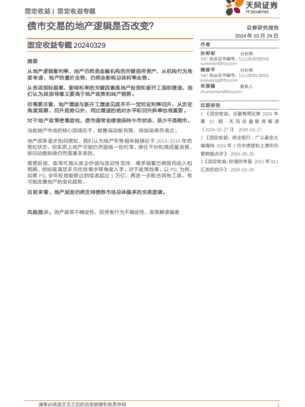 【天风证券】【20240329】固定收益专题:债市交易的地产逻辑是否改变?-15页 行业研究