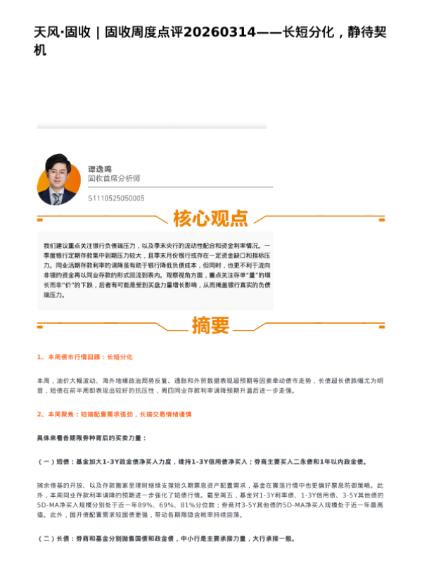 【天风证券】【202603】天风·固收___固收周度点评20260314——长短分化,静待契机-3页 证券期货研究报告