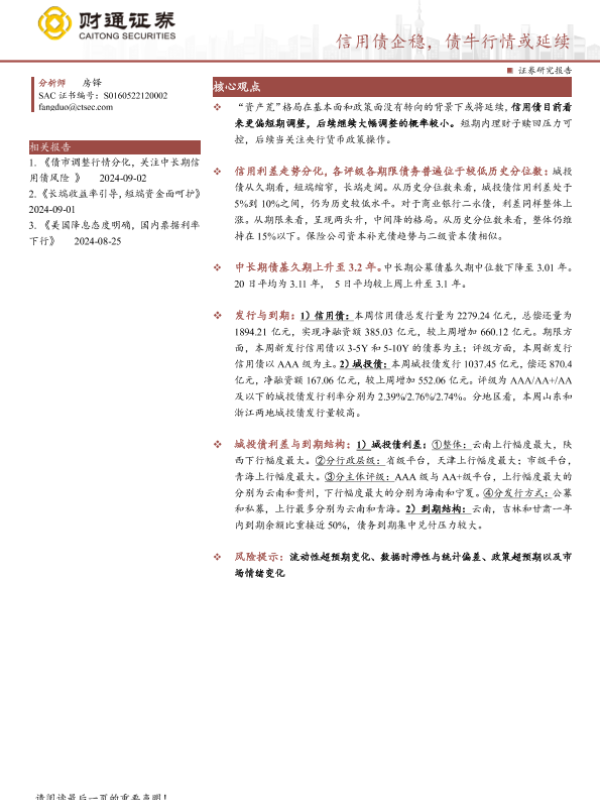 【财通证券】【20240908】信用债企稳,债牛行情或延续-14页 行业研究
