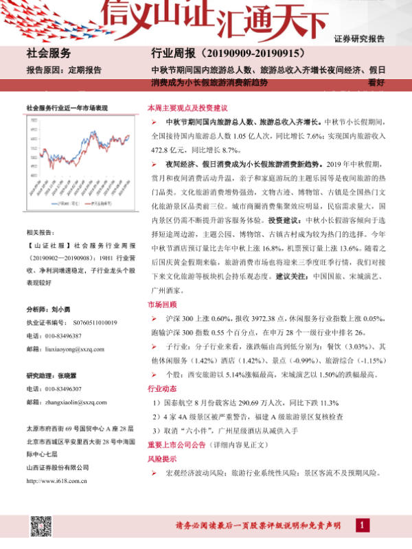 【山西证券】【20190916】社会服务行业周报:中秋节期间国内旅游总人数、旅游总收入齐增长夜间经济、假日消费成为小长假旅游消费新趋势-9页 行业研究