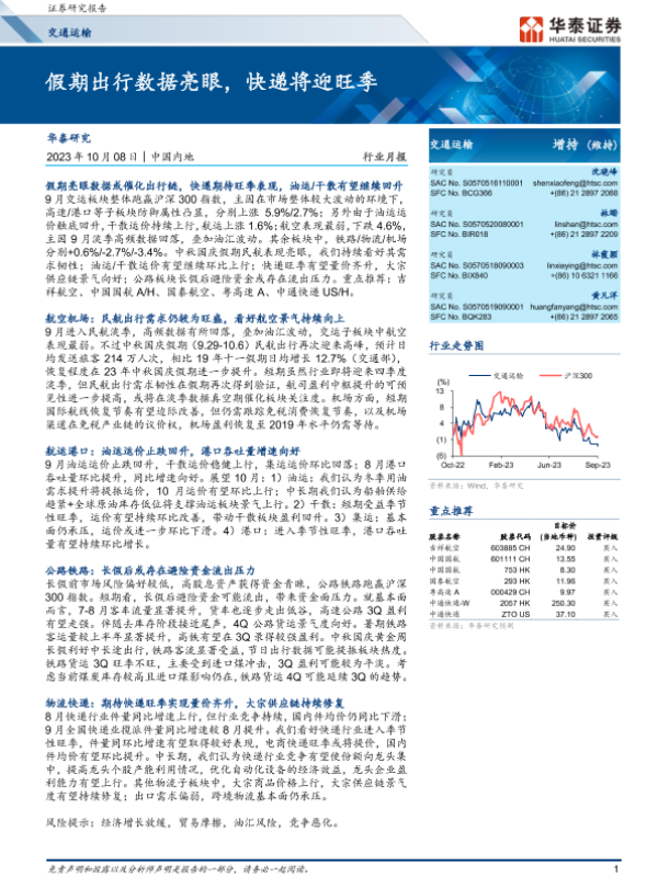 【华泰证券】【20231008】交通运输行业月报:假期出行数据亮眼,快递将迎旺季-18页 行业研究