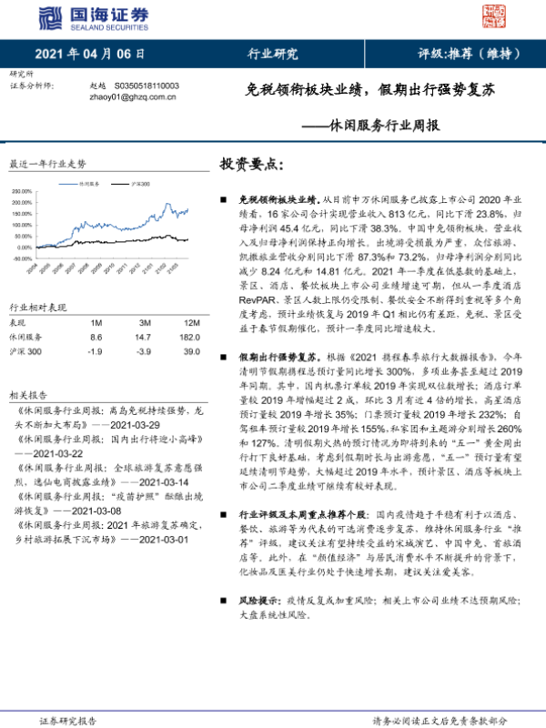 【国海证券】【20210406】休闲服务行业周报:免税领衔板块业绩,假期出行强势复苏-10页 行业研究