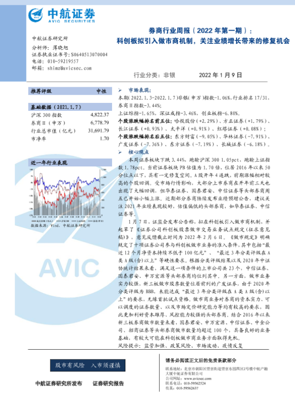 【中航证券】【20220109】券商行业周报(2022年第一期):科创板拟引入做市商机制,关注业绩增长带来的修复机会-5页 行业研究