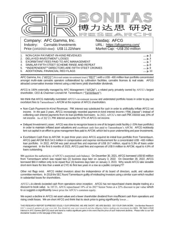 【Bonitas Research LLC】【20231003】博利达斯研究-做空AFC-GAMMA-11页 行业研究