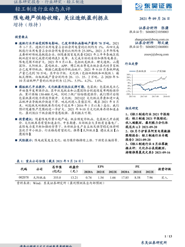 【东吴证券】【20210926】轻工制造行业动态点评:限电趋严供给收缩,关注造纸盈利拐点-13页 行业研究