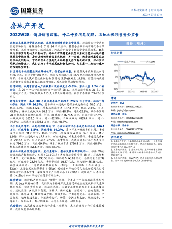 【国盛证券】【20220717】房地产开发2022W28:新房销售回落,停工停贷消息发酵,三地加强预售资金监管-13页 行业研究