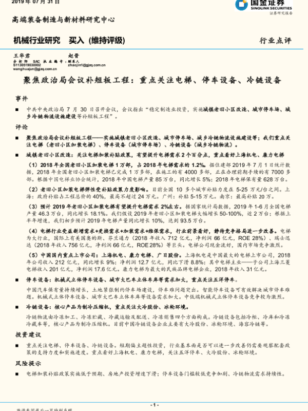 【国金证券】【20190731】机械行业研究:聚焦政治局会议补短板工程:重点关注电梯、停车设备、冷链设备-4页 行业研究