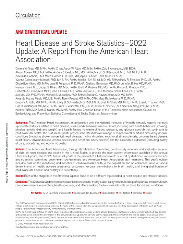 【American Heart Association】【2022】Heart Disease and Stroke Statistics—2022 Update A Report From the American Heart Association-487页 学术论文