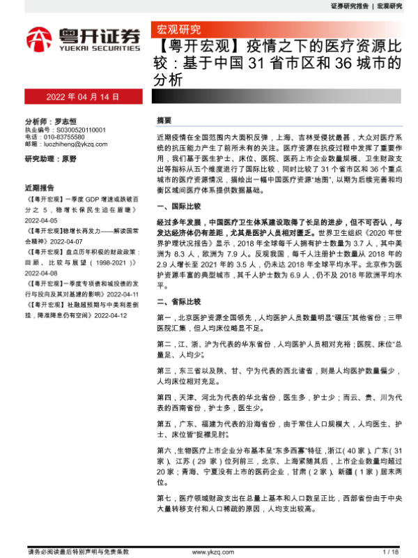 【粤开证券】【20220414】疫情之下的医疗资源比较:基于中国31省市区和36城市的分析-18页 行业研究