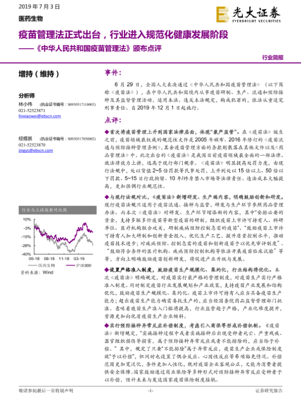 【光大证券】【20190703】医药生物行业简报:《中华人民共和国疫苗管理法》颁布点评-4页 行业研究