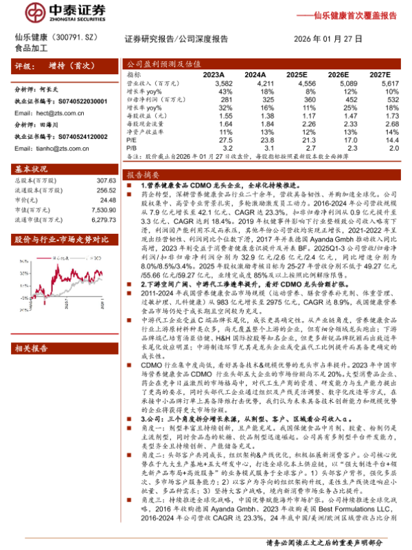 【中泰证券】【202601】仙乐健康(300791)首次覆盖报告:营养健康食品CDMO龙头,全球化战略持续推进-22页 证券期货研究报告
