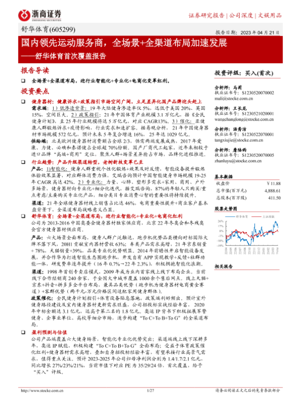 【浙商证券】【20230421】舒华体育首次覆盖报告:国内领先运动服务商,全场景+全渠道布局加速发展-27页 行业研究