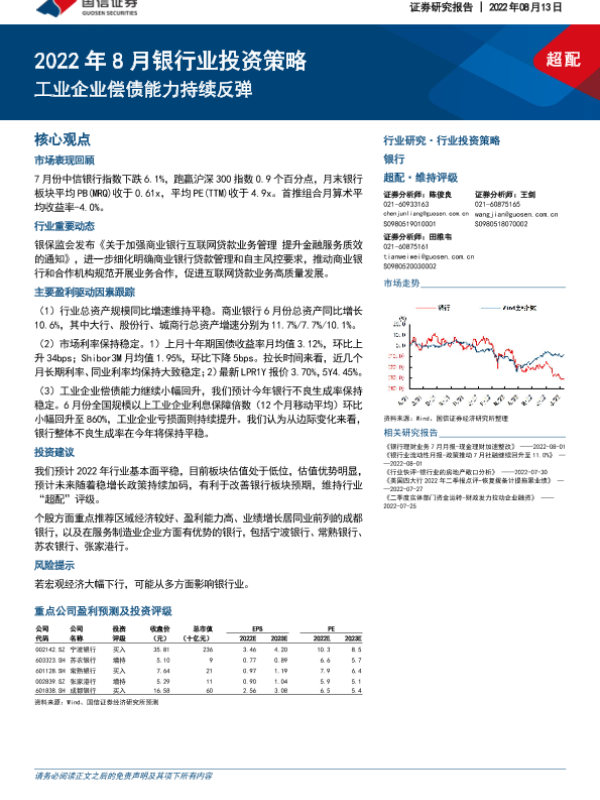 【国信证券】【20220813】2022年8月银行业投资策略:工业企业偿债能力持续反弹-8页 行业研究