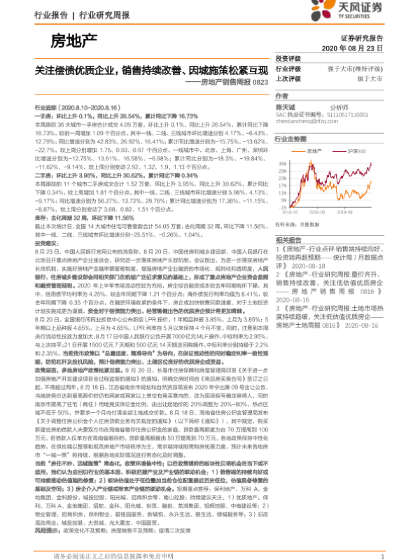【天风证券】【20200823】关注偿债优质企业,销售持续改善、因城施策松紧互现-13页 行业研究