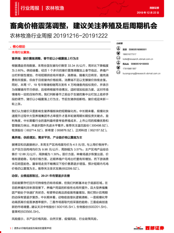 【西部证券】【20191222】20191222-西部证券-农林牧渔行业周报:畜禽价格震荡调整,建议关注养殖及后周期机会-11页 行业研究