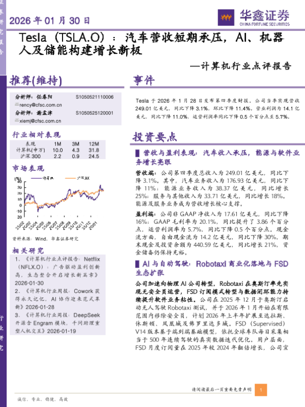 【华鑫证券】【202601】Tesla(TSLA.O) :汽车营收短期承压,AI、机器人及储能构建增长新极-5页 证券期货研究报告