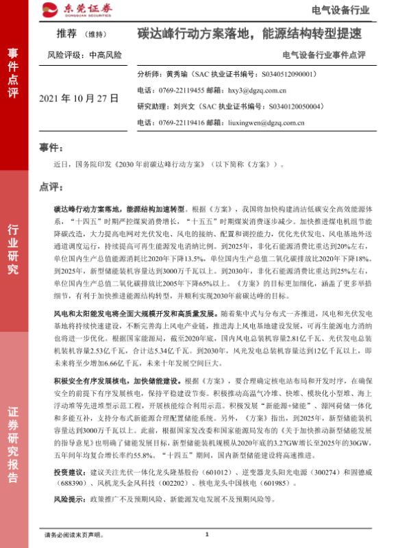 【东莞证券】【20211027】电气设备行业事件点评:碳达峰行动方案落地,能源结构转型提速-2页 行业研究