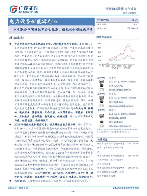 【广发证券】【20210418】电力设备新能源行业:中美联合声明增配可再生能源,储能机制望迎来完善-4页 行业研究