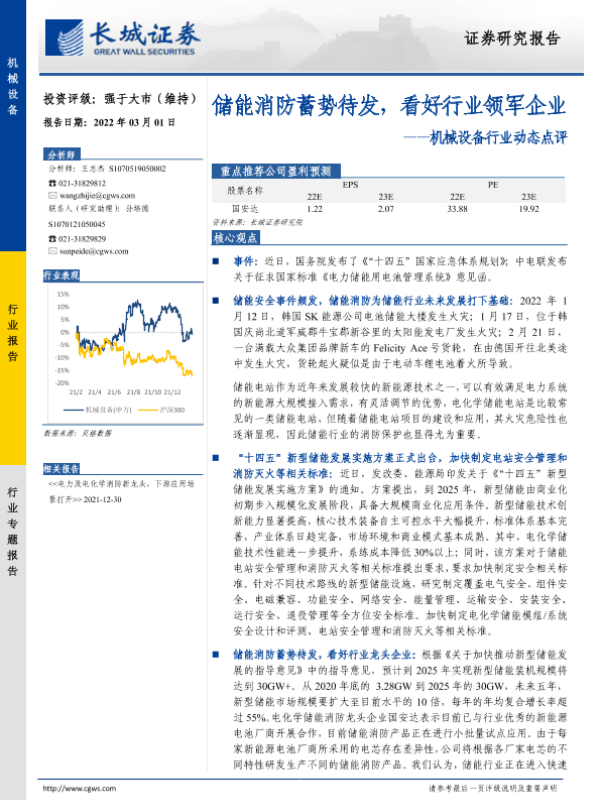 【长城证券】【20220301】20220301-长城证券-机械设备行业动态点评:储能消防蓄势待发,看好行业领军企业-3页 行业研究