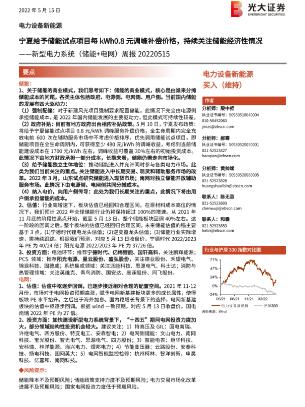 【光大证券】【20220515】20220515-光大证券-新型电力系统(储能+电网)周报:宁夏给予储能试点项目每kWh0.8元调峰补偿价格,持续关注储能经济性情况-9页 行业研究