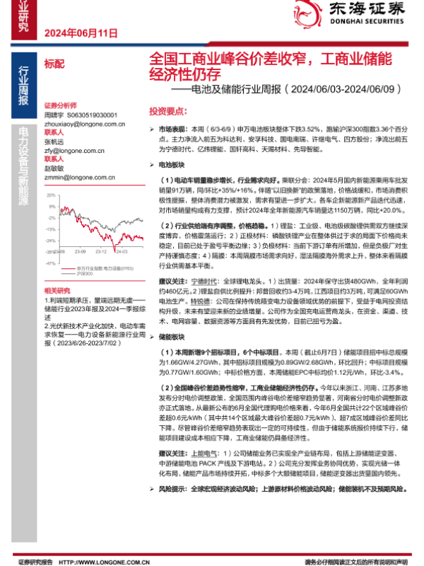 【东海证券】【20240611】全国工商业峰谷价差收窄,工商业储能经济性仍存——电池及储能行业周报(2024/06/03-2024/06/09)-13页 行业研究