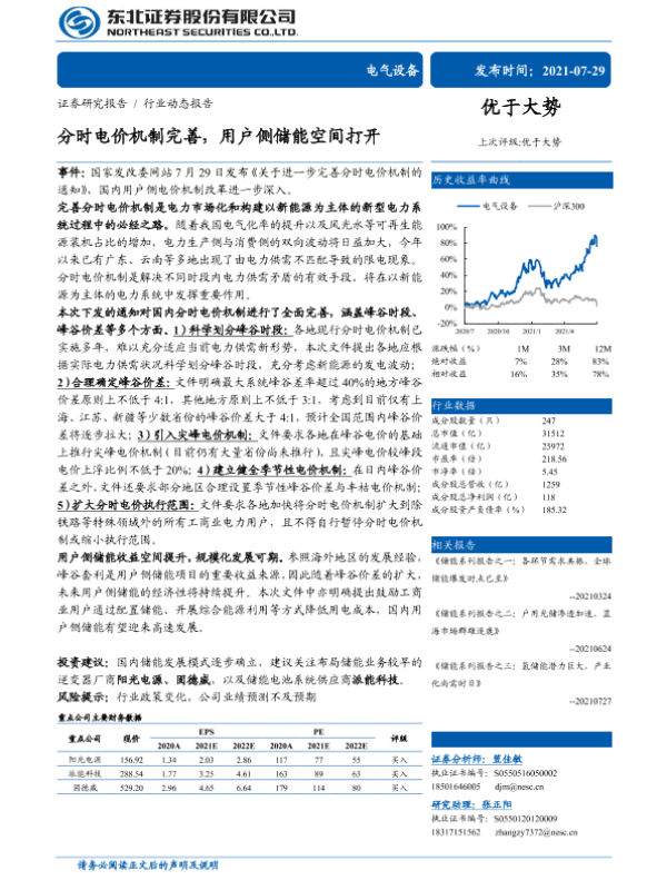 【东北证券】【20210729】20210729-东北证券-电气设备行业动态报告:分时电价机制完善,用户侧储能空间打开-3页 行业研究