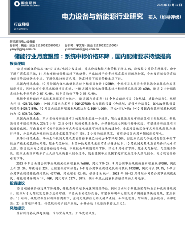 【国金证券】【20231117】储能行业月度跟踪:系统中标价格环降,国内配储要求持续提高-12页 行业研究