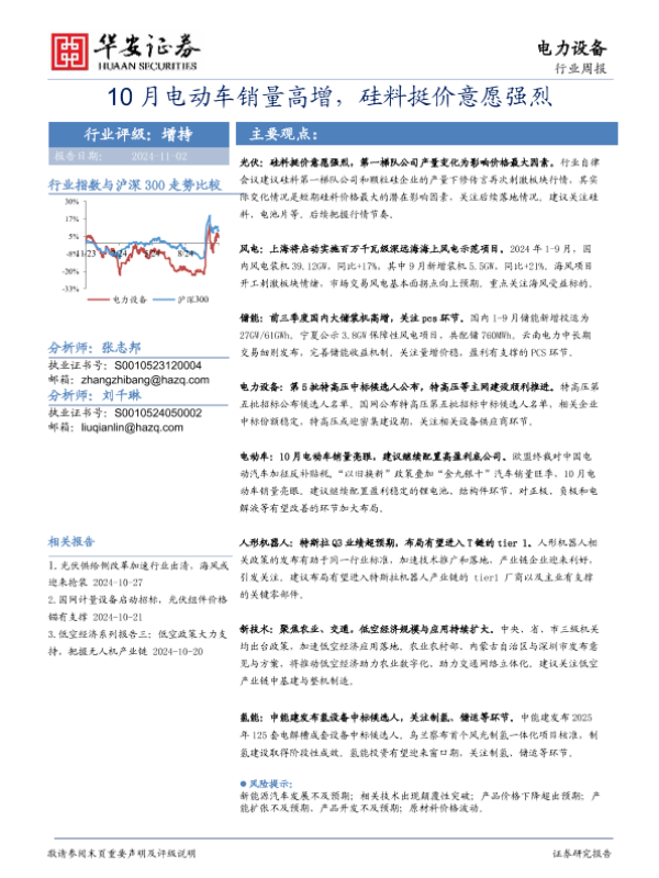 【华安证券】【20241102】20241102-华安证券-电力设备行业周报:10月电动车销量高增,硅料挺价意愿强烈-18页 行业研究