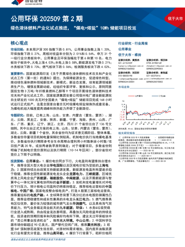 【国信证券】【202509】公用环保行业202509第2期:绿色液体燃料产业化试点推进,“煤电+熔盐”1GWh储能项目投运-32页 证券期货研究报告