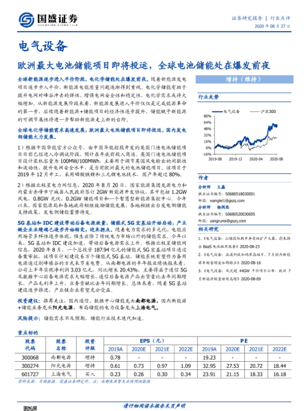 【国盛证券】【20200827】电气设备:欧洲最大电池储能项目即将投运,全球电池储能处在爆发前夜-2页 行业研究