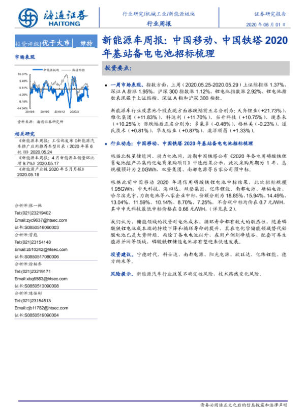【海通证券】【20200601】20200601-海通证券-新能源车周报:中国移动、中国铁塔2020年基站备电电池招标梳理-5页 行业研究