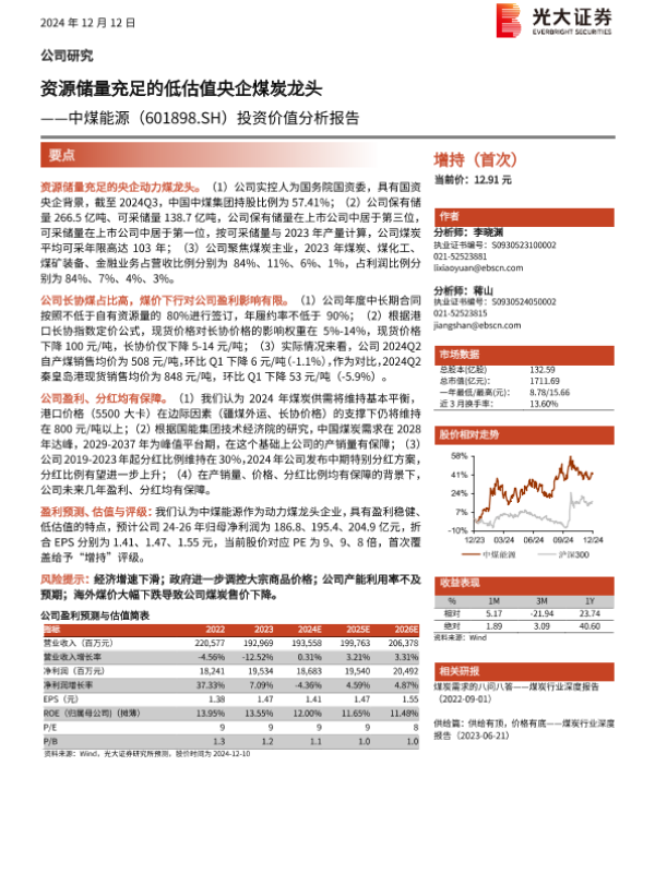 【光大证券】【20241212】中煤能源(601898)投资价值分析报告:资源储量充足的低估值央企煤炭龙头-22页 行业研究