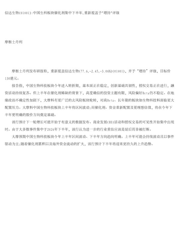 【Morgan Stanley】【2026】中国生科板块催化剂集中下半年,重新覆盖予“增持”评级-1页 行业研究