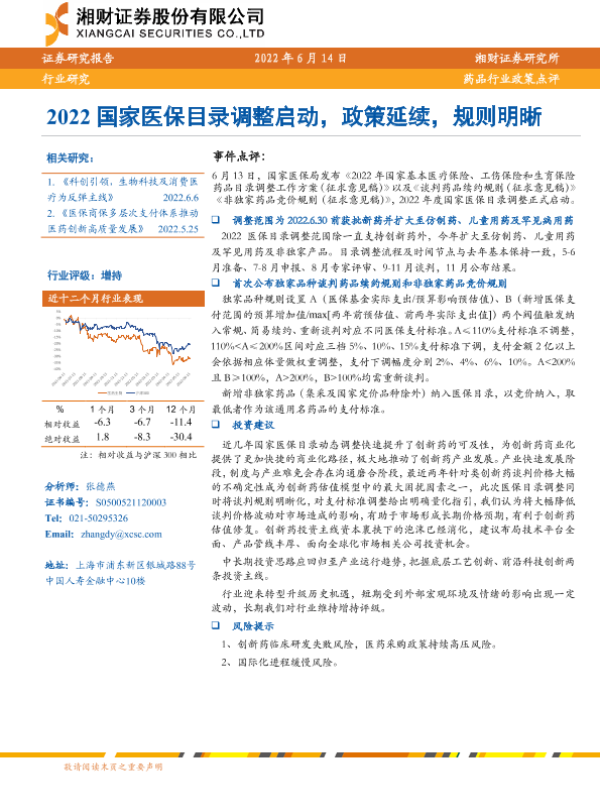 【湘财证券】【20220614】2022国家医保目录调整启动,政策延续,规则明晰-2页 行业研究