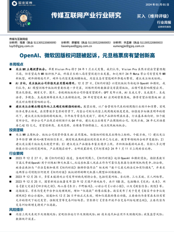 【国金证券】【20240101】传媒互联网产业行业研究:OpenAI、微软因版权问题被起诉,元旦档票房有望创新高-14页 行业研究