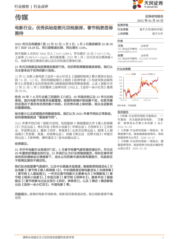 【天风证券】【20210104】电影行业:优秀供给助燃元旦档票房,春节档更值得期待-2页 行业研究